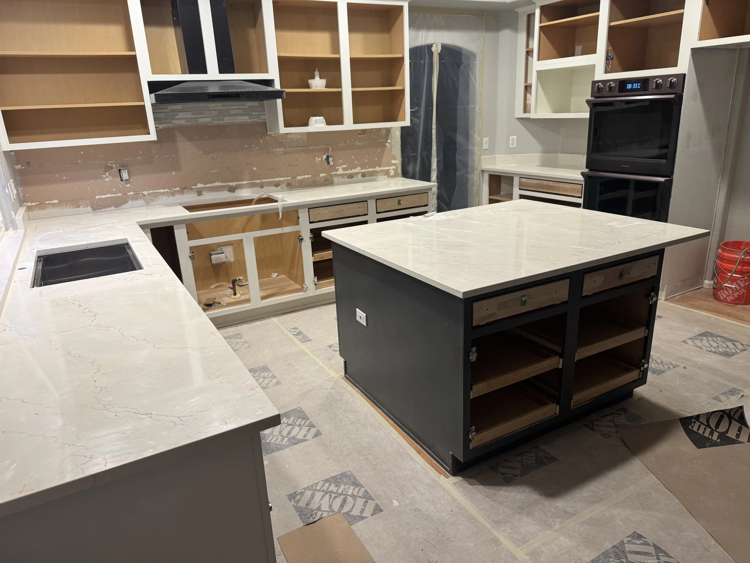 A full kitchen, living room, and office remodel that modernizes the home with clean lines, soft neutrals, and custom built-ins. Thoughtful storage solutions enhance functionality, while the herringbone tile backsplash, warm wood accents, and arched doorway add texture, depth, and architectural interest.